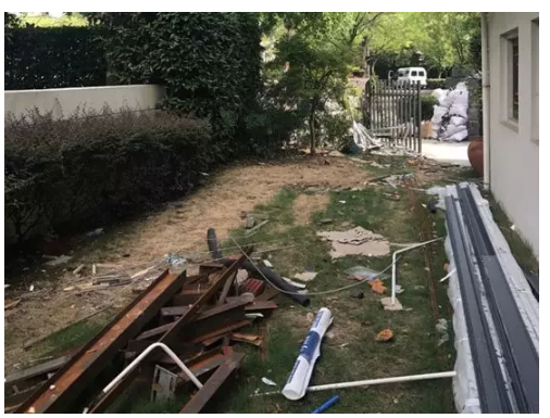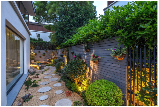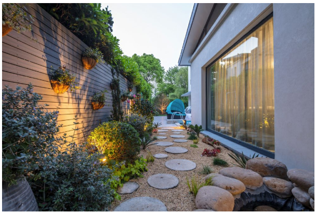 改造前的入口處,大盆栽也缺乏美觀,地面的垃圾已經(jīng)很難清理。原有的房屋建筑,把花園分成了狹小細(xì)長的兩段。面對這些的問題,設(shè)計師另辟蹊徑,將所有問題巧妙化解。