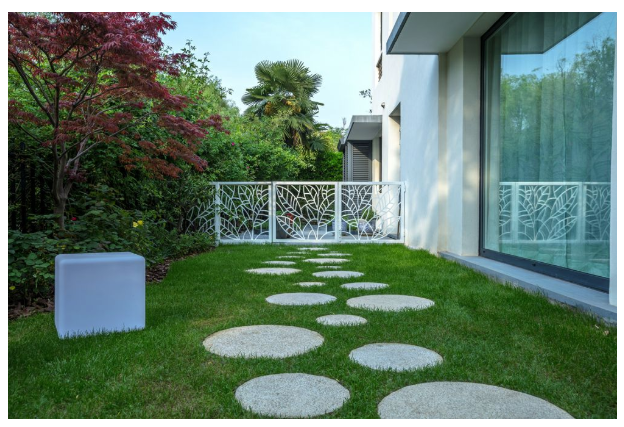 一進(jìn)門一眼就能看到的就是耐候鋼板采用了蒲公英的圖案,充滿了浪漫,它搭配圓形燈為花園的入戶空間增添了溫馨的氛圍。